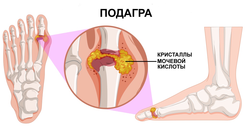 Подагра – это воспалительная форма артрита, вызванная нарушением обмена веществ. Заболевание приводит к накоплению в организме мочевой кислоты и отложению ее излишков в суставах и почках. Как правило, в первую очередь оно поражает стопы и большой палец ноги. Его первые признаки могут включать: